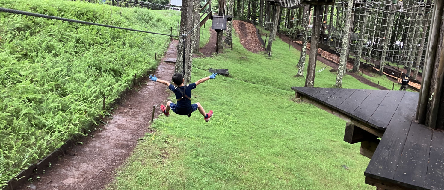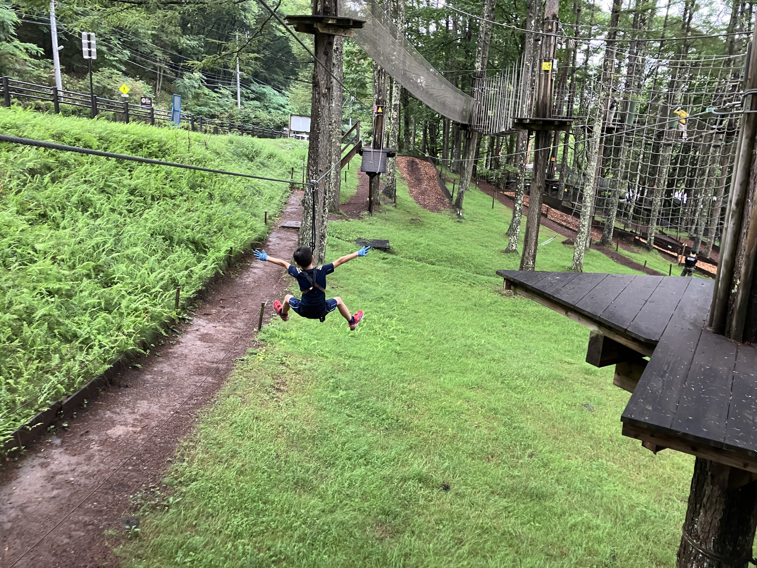 低学年向けのコースは、次男には正直物足りない感があった。コースは2つあったけど、80分でそれぞれ4回回ったと思う。低学年向けコースは、ただ木の上で低レベルなアスレチックをさせているだけって感じ。最後のジップラインだけは本格的だったけど。次男はこのコースをすることはもうなかろう。